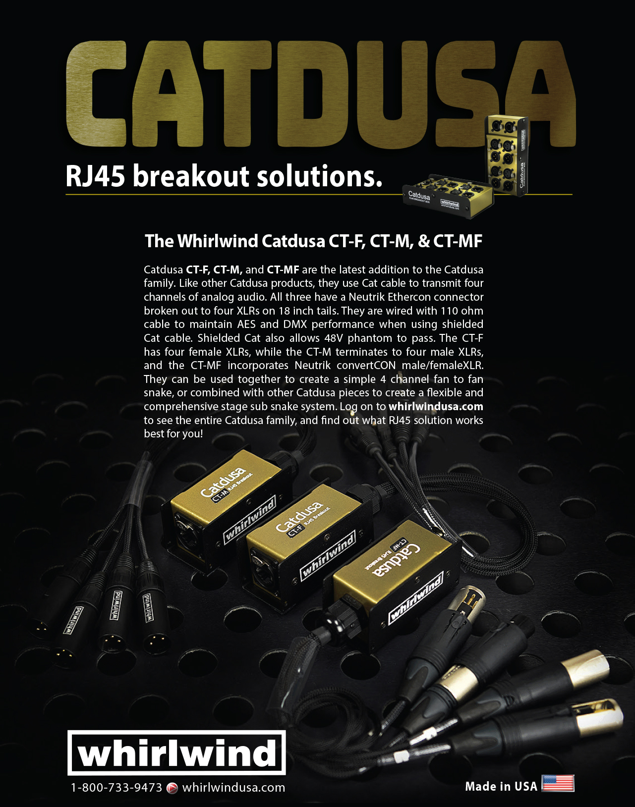 Catdusa CT-F and CT-M are recent additions to the Catdusa family. Like other Catdusa products, they use Cat cable to transmit four channels of analog audio. Both have a Neutrik Ethercon connector broken out to four XLRs on 18 inch tails. They are wired with 110 ohm cable to maintain AES and DMX performance when using shielded Cat cable. Using shielded Cat cable also allows phantom power to pass for condenser microphones. The CT-F has four female XLRs, while the CT-M terminates to four male XLRs, and the CT-MF has 4 interchangable (male/female) XLRs.. They can be used together to create a simple 4 channel fan to fan snake, or they can be combined with other Catdusa pieces to create a flexible and comprehensive stage sub snake system. Check out our entire Catdusa family, and find out what RJ45 solution works best for you!